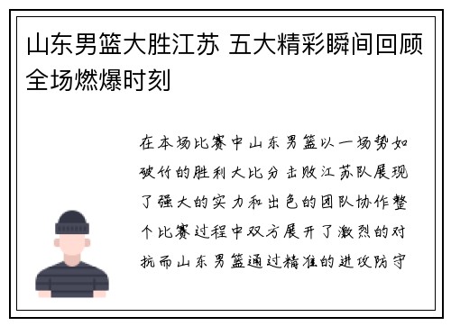 在本场比赛中,山东男篮以一场势如破竹的胜利大比分击败江苏队,展现了强大的实力和出色的团队协作。整个比赛过程中,双方展开了激烈的对抗,而山东男篮通过精准的进攻、防守的压制以及个人球员的精彩发挥,最终将比赛胜利收入囊中。本文将从五大精彩瞬间入手,回顾全场燃爆的时刻,逐一分析比赛中的亮点,呈现出山东男篮的精彩表现和他们对江苏队的全面压制。文章将从进攻端的火力全开、关键时刻的个人英雄主义、防守端的稳固屏障、球员的默契配合等几个方面,详细回顾这场比赛的亮点,并总结山东男篮如何凭借全队的努力和个人的精彩表现,迎来了一场酣畅淋漓的胜利。
